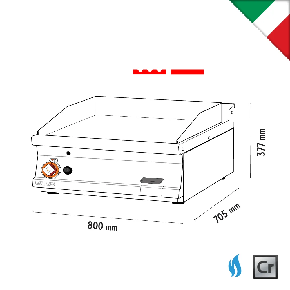 Πλατώ αερίου διπλό FTLRT-78GS χρωμίου υγραερίου με ισχύ 14kW. Διαθέτει 2 διαφορετικές πλάκες, ραβδωτή και λεία χρωμίου, έτσι ώστε να μπορείτε να ψήσετε σχεδόν τα πάντα, από αυγά και λαχανικά στην λεία επιφάνεια έως κρέατα στην ραβδωτή. Η πλάκα χρωμίου έχει ενισχυμένη αντικολλητική ιδιότητα, περιορίζει τη μεταφορά οσμών και μπορεί να καθαριστεί.