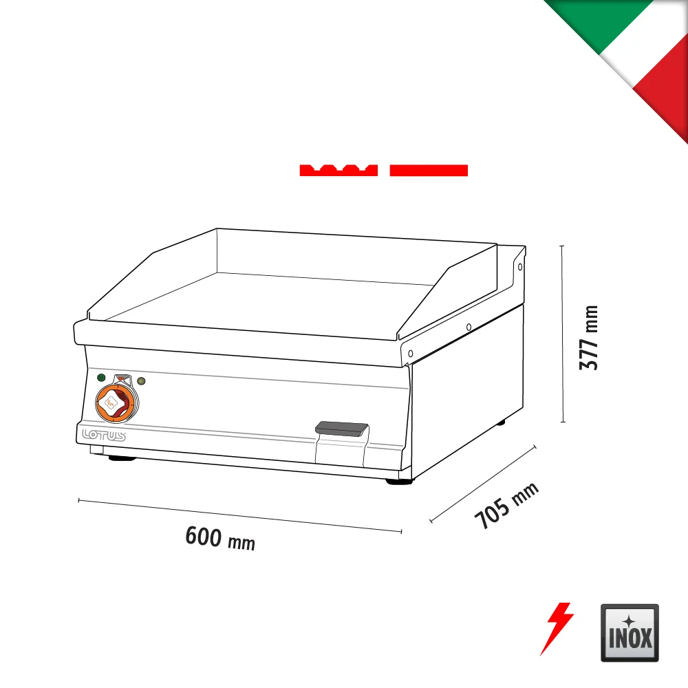 Πλατώ ηλεκτρικό μεσαίο FTLRT-76ET ψησίματος της εταιρείας Lotus, με ισχύ 7.4kW. Διαθέτει λεία πλάκα και είναι ιδανικό για υγιεινό ψήσιμο και κατάλληλο για όλα τα είδη τροφίμων όπως κρέατα και λαχανικά. Λειτουργεί με ρεύμα καθιστώντας την εγκατάστασή του πιο ευέλικτη στο χώρο της κουζίνας. Καθώς δεν διαθέτει βάση τοποθετείται σε ανοξείδωτο τραπέζι ή σε πάγκο εργασίας.