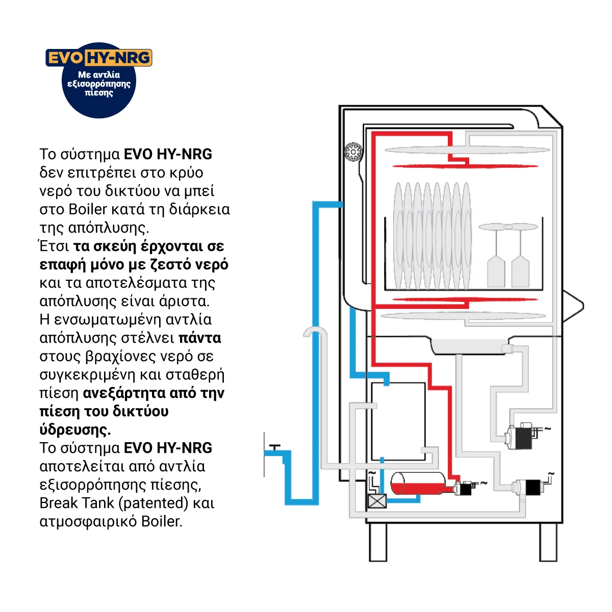 Το σύστημα HY-NRG δεν επιτρέπει στο κρύο νερό του δικτύου να μπεί στο Boiler κατά την διάρκεια της απόπλυσης.Έτσι τα σκεύη έρχονται σε επαφή μόνο με ζεστό νερό και τα αποτελέσματα της απόπλυσης είναι άριστα.Η ενσωματωμένη αντλία απόπλυσης στέλνει πάντα στους βραχίονες νερό σε συγκεκριμένη και σταθερή πιέση ανεξάρτητα από την πίεση του δικτύου ύδρευσης.Το σύστημα HY-NRG απότελείται από αντλία εξισορρόπησης πιέσης , Break Tank (patened) και ατμοσφαιρικό Boiler.